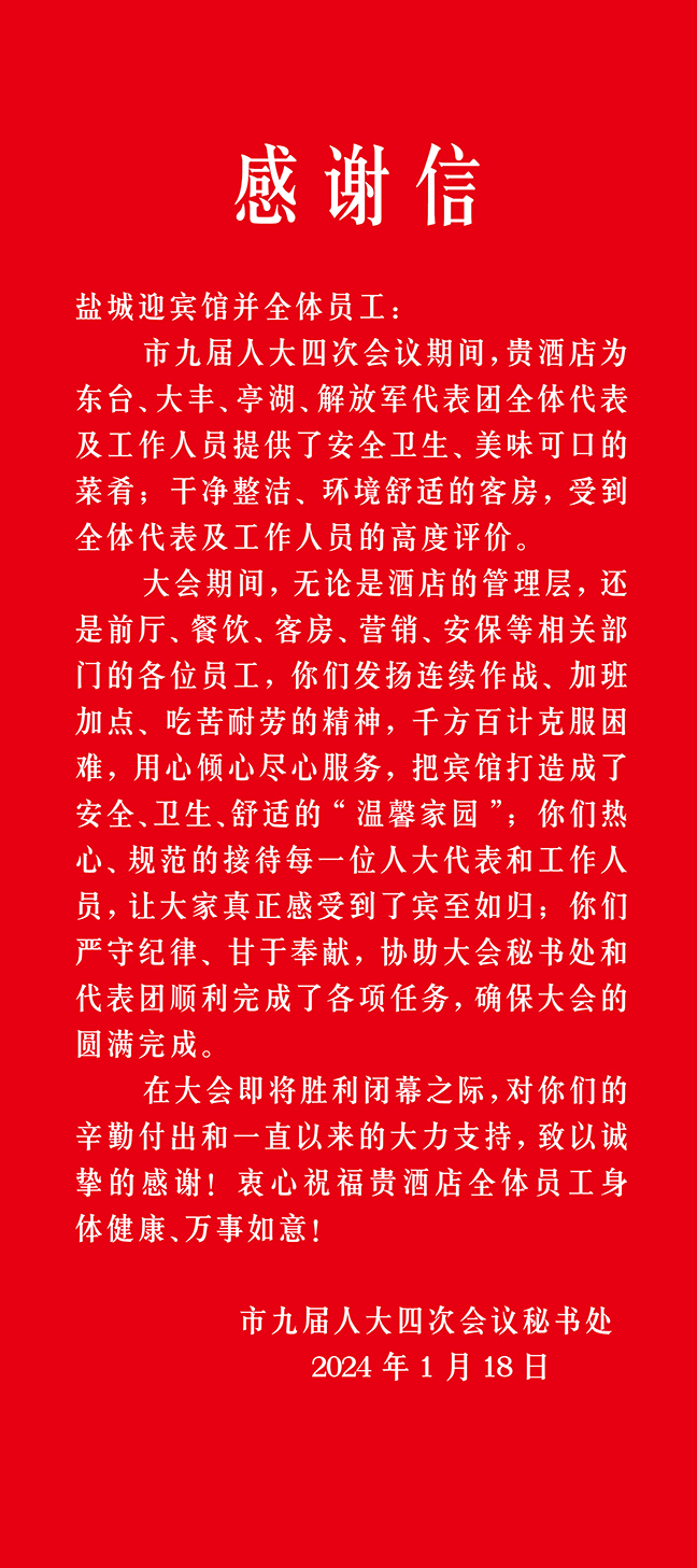 本次服務(wù)保障工作的圓滿完成,為酒店接待工作進(jìn)一步積累了寶貴經(jīng)驗(yàn),也檢驗(yàn)了全體員工的專業(yè)素養(yǎng)和職業(yè)技能。會(huì)后,大會(huì)秘書處、解放軍代表團(tuán)、亭湖代表團(tuán)、大豐代表團(tuán)、東臺(tái)代表團(tuán)等紛紛發(fā)來感謝信共計(jì)76封,對(duì)酒店接待服務(wù)保障工作給予高度評(píng)價(jià)。鹽城迎賓館將認(rèn)真總結(jié)成功經(jīng)驗(yàn),牢固樹立“服務(wù)第一、品牌優(yōu)先”的經(jīng)營(yíng)理念,不斷在優(yōu)化服務(wù)品質(zhì)和服務(wù)細(xì)節(jié)上下功夫,持續(xù)提升管理水平和服務(wù)質(zhì)量。